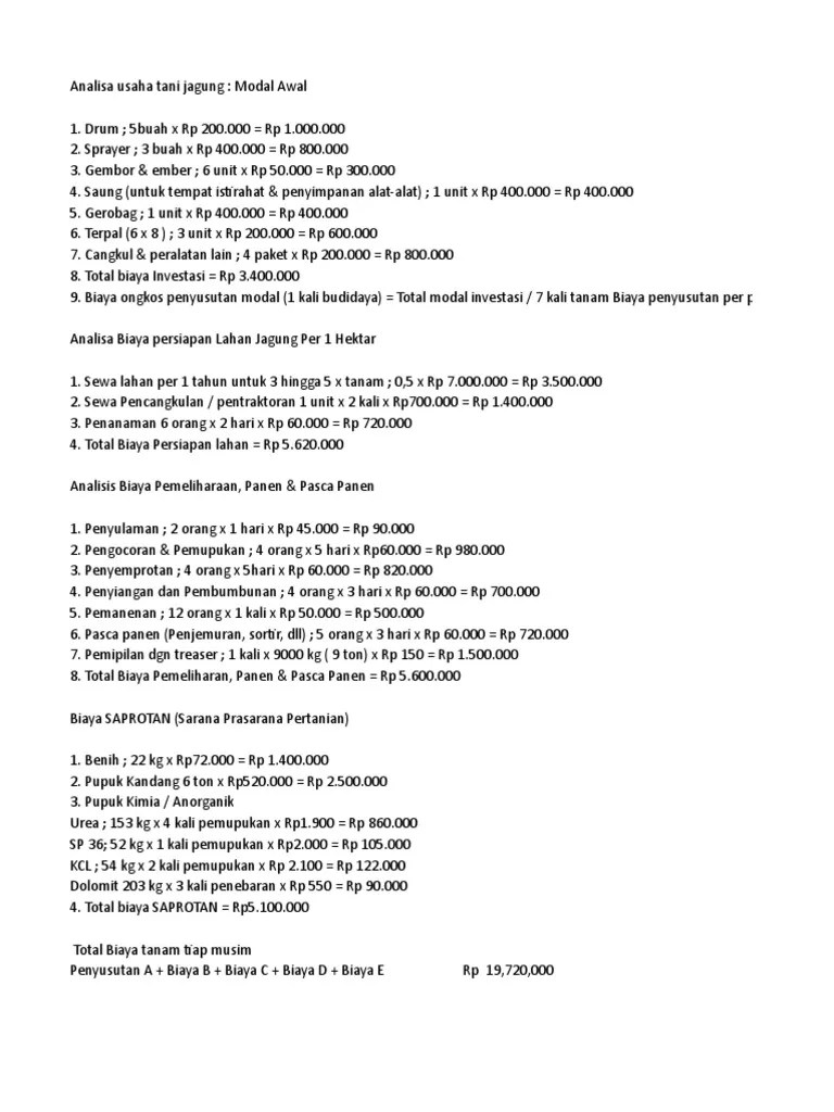 Dengan harga bibit ayam usia sehari (doc) yang bergerak naik ke rp13.000 per ekor, ditambahan kenaikan harga jagung, biaya produksinya menjadi rp19.800 per kg. Upaya meningkatkan produktivitas jagung di lahan kering melalui penerapan teknologi baru dengan tingkat input tertentu memerlukan biaya produksi yang lebih besar. Selamat pagi, saya berencana menanam jagung seluas 2,5 ha , mohon bantuannya untuk mengirimkan "analisa usaha budidaya jagung skala 1 hektar" berikut panduannya sebagai langkah awal saya memulai bertani jagung. Faktor biaya benih diperoleh t hitung sebesar 1,547 dan t tabel 1,675 dengan tingkat signifikansi sebesar 0,128(tabel 4).hal ini mengandung makna bahwa faktor produksi benih berpengaruh tidak signifikan terhadap produksi jagung manis. Tabel nilai produksi dan biaya produksi per musim tanam per hektar budidaya tanaman padi sawah padi ladang jagung dan kedelai 2017 didapatkan dari hasil survei struktur ongkos padipalawija yang dilakukan di 34 provinsi di indonesia.